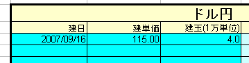 入力項目は、「建日」「建単価」「建玉(1万単位)」です。このうち、建日に関しては計算に使っていませんので、入力しなくても問題ありませんが、状況を把握するためには必要でしょう。また、建玉の欄が赤色になる場合があります。これは、建単価が入力されていない場合に発生します。計算上でおかしな事が発生するので、建玉のみの入力は行わないでください。また、取引業者によっては千ドル単位の取引が出来る業者もありますので、その場合は千ドル=0.1で入力してください。