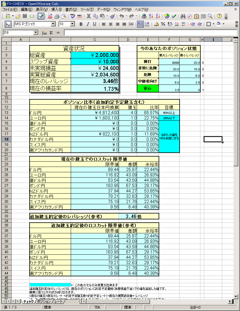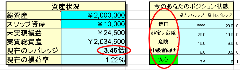 特に注意すべき点は、「現在のレバレッジ」です。また、このレバレッジの値で、「今のあなたのポジション状態」の項目の色が「安心」「中級者向け」「危険」「非常に危険」「博打」と変わります。なお、それぞれの項目の上にマウスを置くと、それぞれの項目に対するコメントが出ますので、参考にしてください。