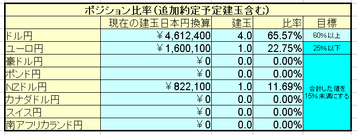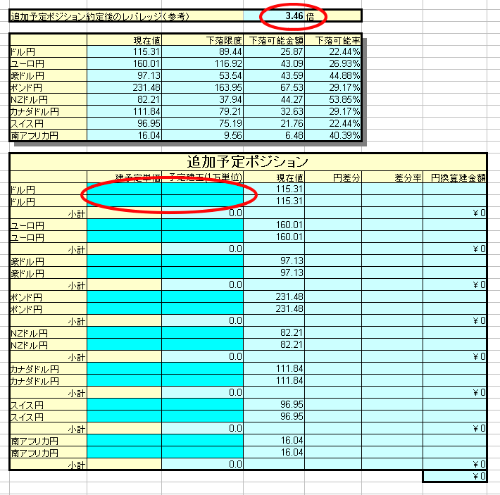 まず、一つの通貨を購入予定金額で購入したと仮定して、通常の建玉の記入位置へ記入して下さい。