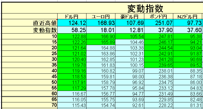 この変動指数とは、各通貨の変動率を考慮に入れた、最高値からの下落値です。0の時に最高値と現在値が同じレートで、100が指定した変動率いっぱいに安値になった時を示します。変動指数がマイナスの時は直近高値より現在値の方が高くなっている状態なので、直近高値を更新してください。なお、現在の為替レートの位置もグラフ風に見られます。利用方法は、買値を考えるときに使用してください。通常、買値は日本円で考えますが、NZドルの1円とポンドの1円では、重みが違いますので同じに考える事が出来ません。更に変動率を考慮すると、非常に難しいです。そこで変動指数を導入し、金額ではなく変動指数で考えると値動きがイメージし易くなると考えます。例:変動指数が60以上の時しか建玉を建てない事とする(この値を推奨しているわけではありません)。