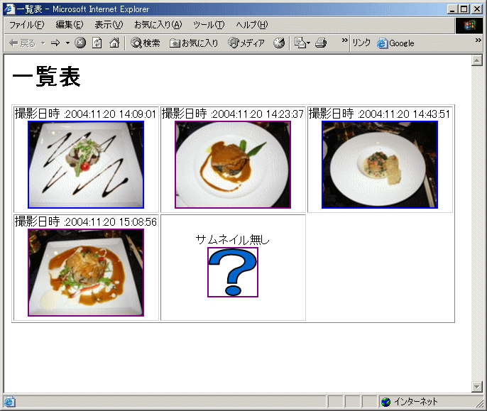 動作詳細:デジカメの写真にはEXIFという領域があってサムネイルや撮影年月日や撮影時の詳細な情報が入っています。それらから必要な情報を取得して一覧表形式htmlで表示する為のプログラムです。また、元画像へのリンクも設定されます。